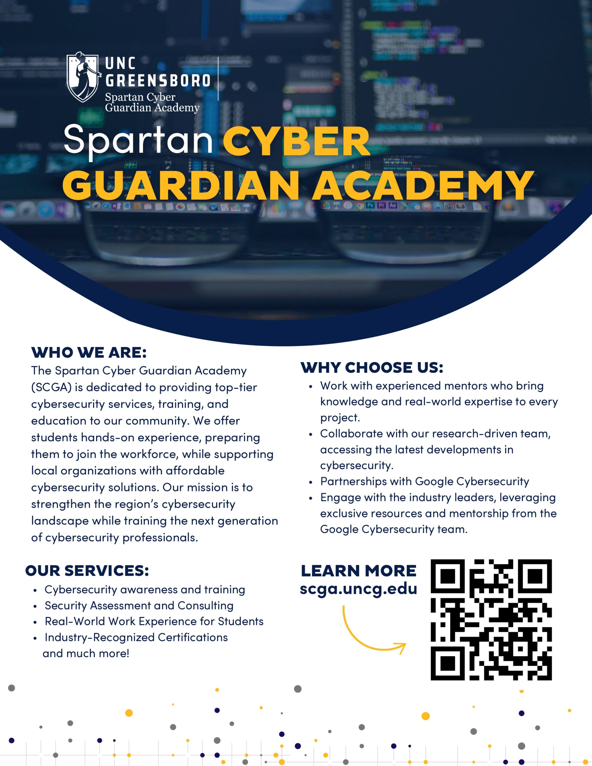 The SCGA Cyber Security Lab at UNCG is dedicated to offering cybersecurity services to local non-profit organizations, educational institutions, small to medium sized businesses, and other community organizations that face growing cyber threats but lack the necessary resources or expertise.